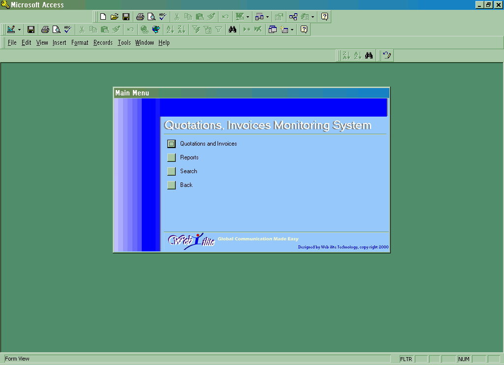 This screen allows user to choose among four buttons: Quotation and Invoices, Reports, Search and Back.