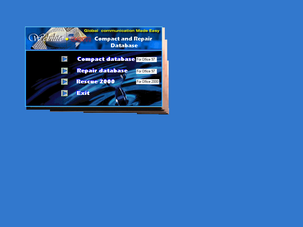 The database might be corrupted due to accident, such as: power failure and unexpected termination of program. Whatever, the cause of the corruption, it is possible to rescue it by performing the following. However, if the following procedure fails, you will need to use your backup database to restore your existing database as explained in section 5.1.3. If you are using Office97 see section 5.2.1, and if you are using Office 2000 see section 5.2.2.
