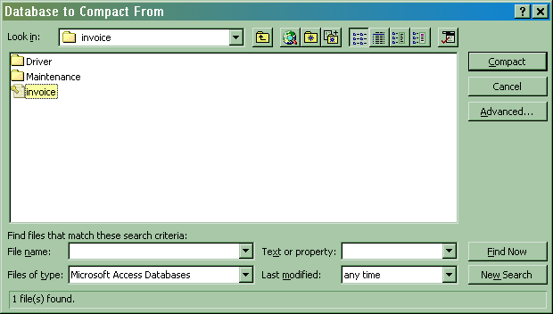 Step 3. From the Database to Compact From screen, click on the indicator Look in and locate the file Invoice in the directory C:\invoice.