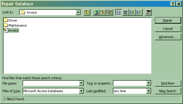 Step 3. From the Repair Database screen, click on the indicator Look in and locate the file Invoice in the directory C:\invoice.